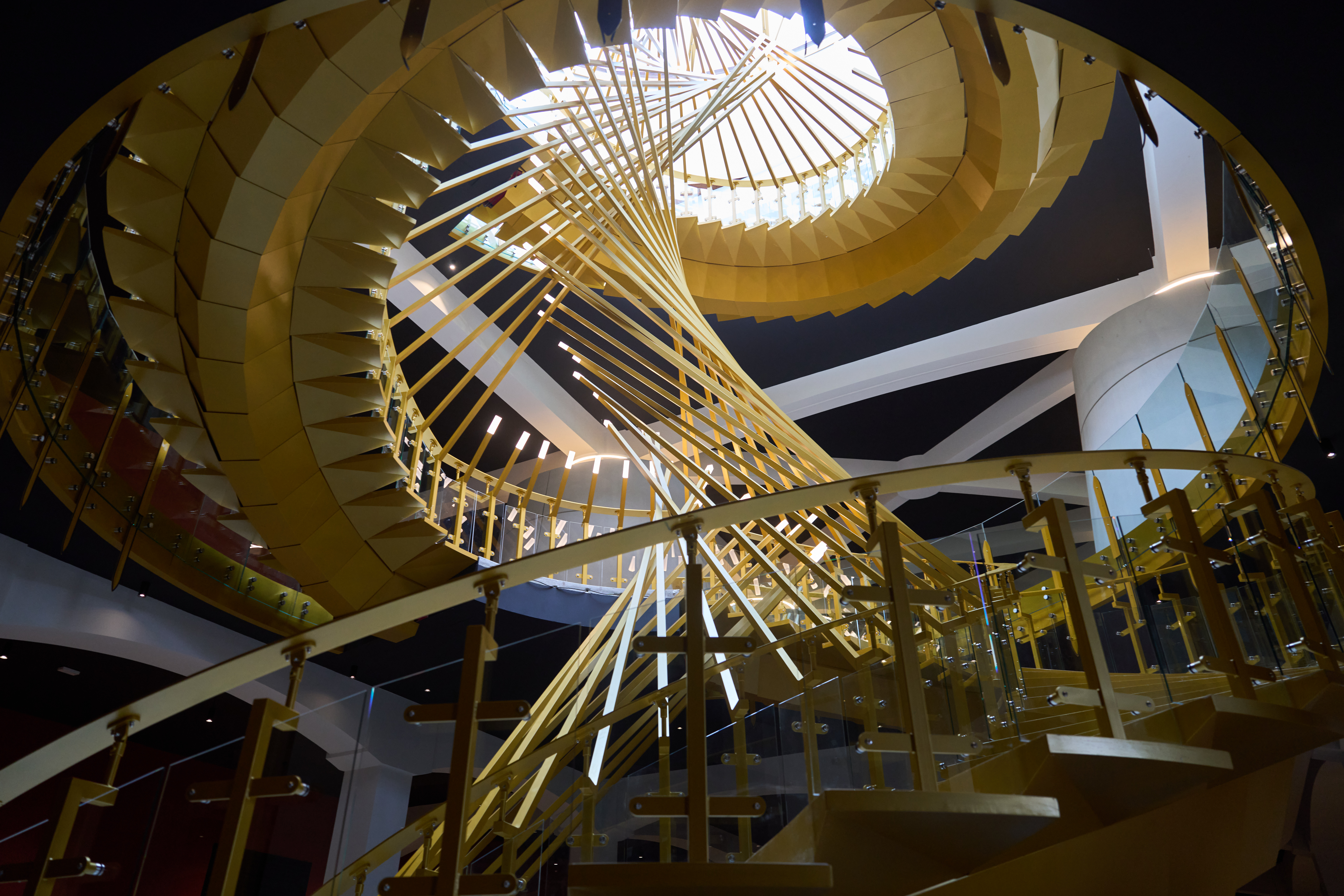 Trois des quatre façades du bâtiment sont partiellement enterrées, permettant ainsi d’exploiter la fraîcheur naturelle du sol à 15°C, une température optimale pour l’élevage du vin. Un escalier de 10 mètres de diamètre relie tous les étages, créant un effet de "cheminée" qui répartit uniformément le froid dans tout le bâtiment.