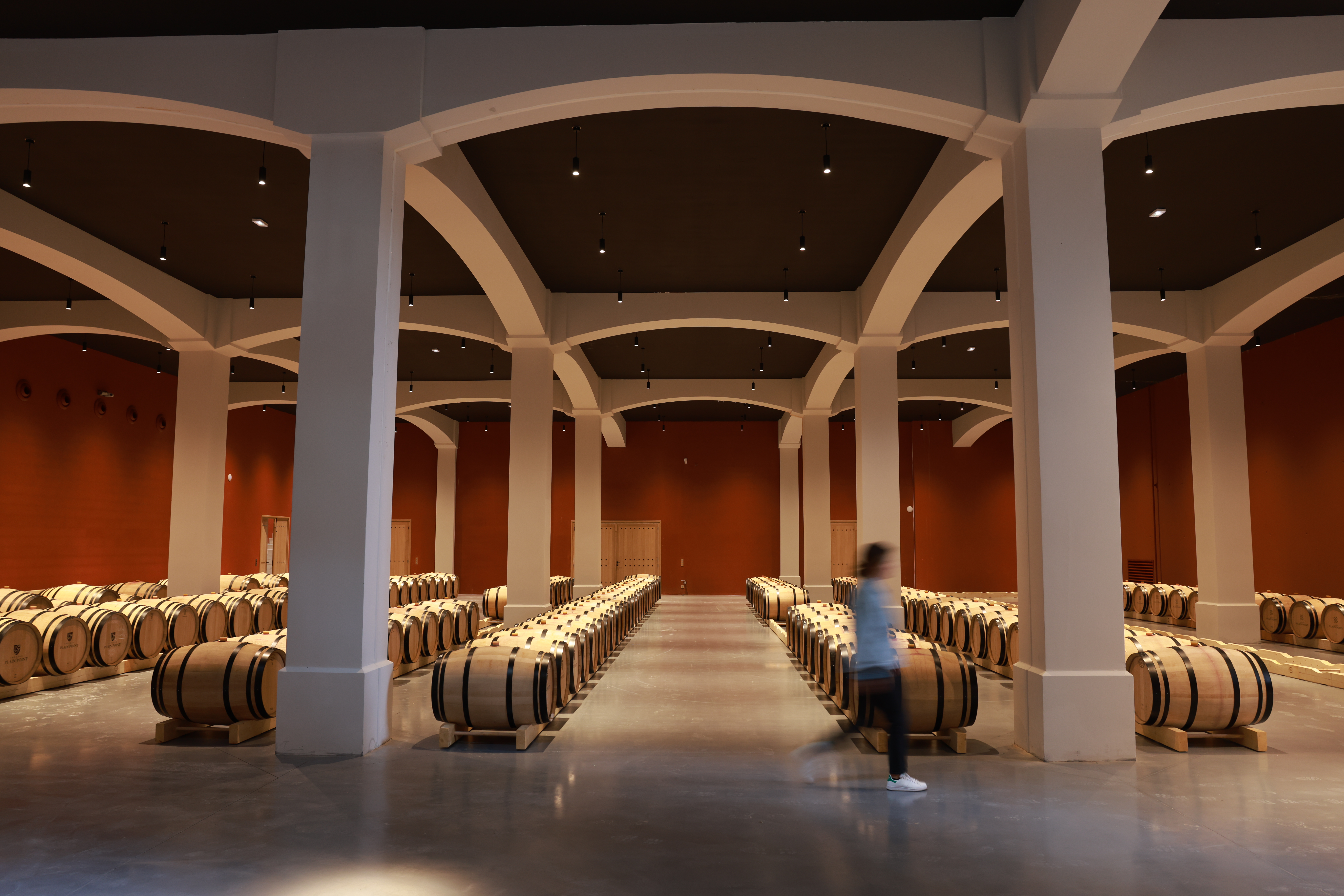 Implanté à flanc de colline, le chai bénéficie d'un dénivelé de 15 mètres qui favorise un processus gravitaire optimal. La vendange entame son parcours au rez-de-chaussée, puis descend graduellement aux étages inférieurs au fur et à mesure de la vinification, pour finalement parvenir au niveau -4, où se déroule l'élevage final.
