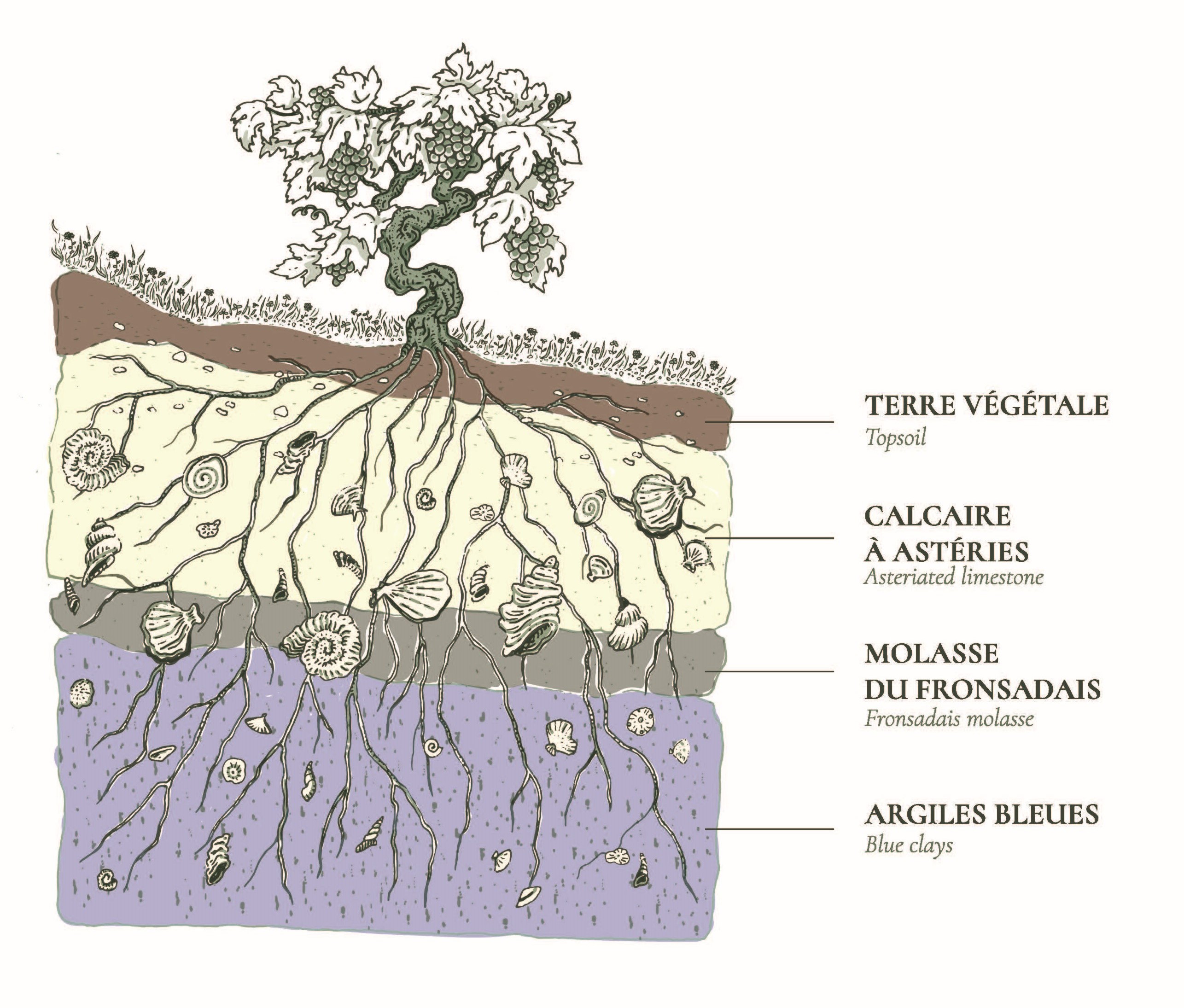 La molasse du Fronsadais, quant à elle, offre des sols équilibrés, mêlant l'argile à la fraîcheur des pierres calcaires. Ces sols conviennent parfaitement au merlot et au cabernet franc, offrant des vins ronds, fins et d'une remarquable fraîcheur fruitée.